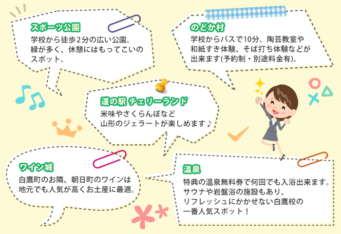 学校周辺には楽しめるスポットが色々あります!
