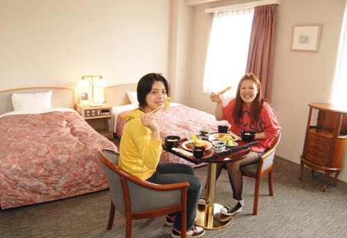 3食付きのツインプランです。 お食事は、朝はホテル内レストランにて(メインホテルはバイキング、都城サンプラザホテルは日替わり定食)、昼食は学校内にてお弁当、夕食はホテル内にて日替わり定食となります。